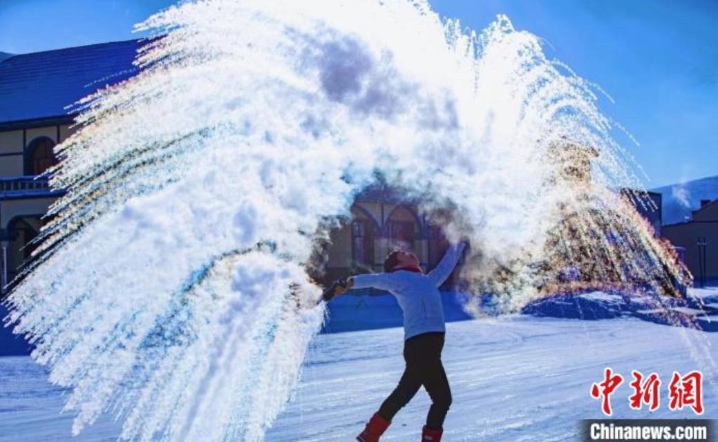 資料圖。圖為游客在極寒天氣下潑水成冰?!∨d安盟委宣傳部供圖