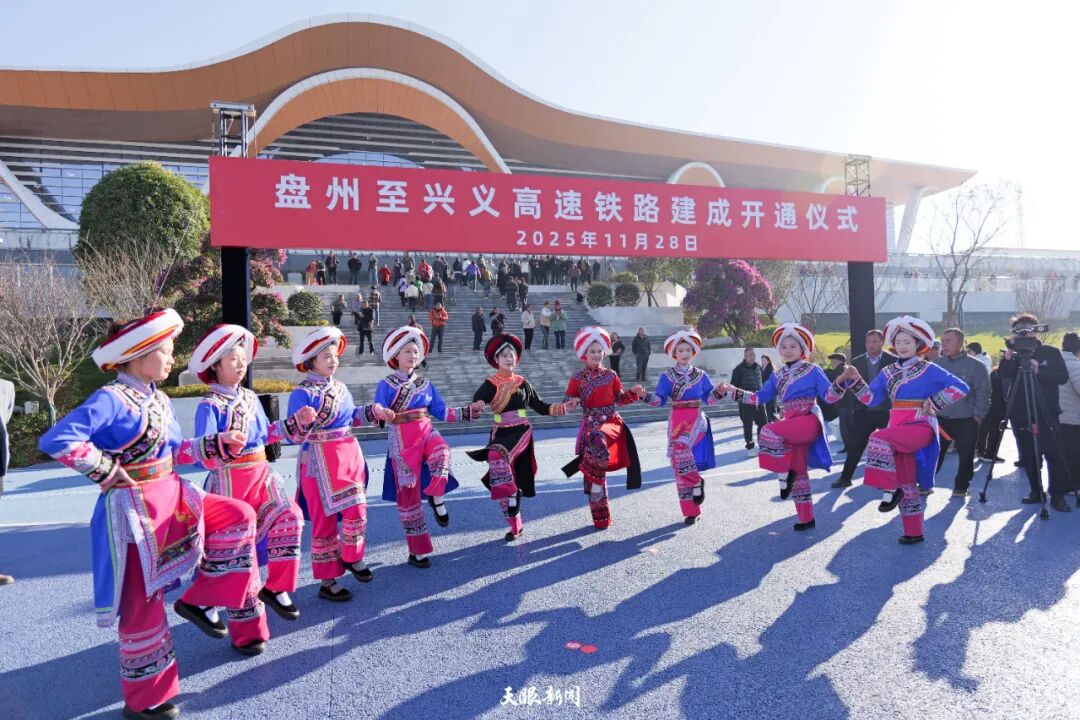 11月28日,盤州至興義高速鐵路(盤興高鐵)開通儀式在興義南站站前廣場舉行,群眾在廣場上跳起踢踏舞慶祝。貴州日報天眼新聞記者黃飛鴻攝