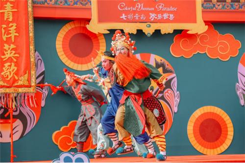 七彩云南·古滇名城旅游康養度假區內熱鬧非凡,足不出省看“央視同款鼓舞”——稷山《高臺花鼓》。該鼓舞曾登臺2008年北京奧運會開幕式、2009年央視春晚表演,也是山西省首批非物質文化遺產。其舞臺特色以“高、奇、險、絕”聞名,表演者在十幾條板凳疊摞起的近6米“金字塔”造型高臺上,進行“水中撈月”、“倒掛金鐘”等花式打鼓,展現千百年來傳承者們守正創新、大放光彩的民間鼓藝術,用鼓、樂、舞的形式表達喜悅之情,祈求來年豐收的美好愿望。