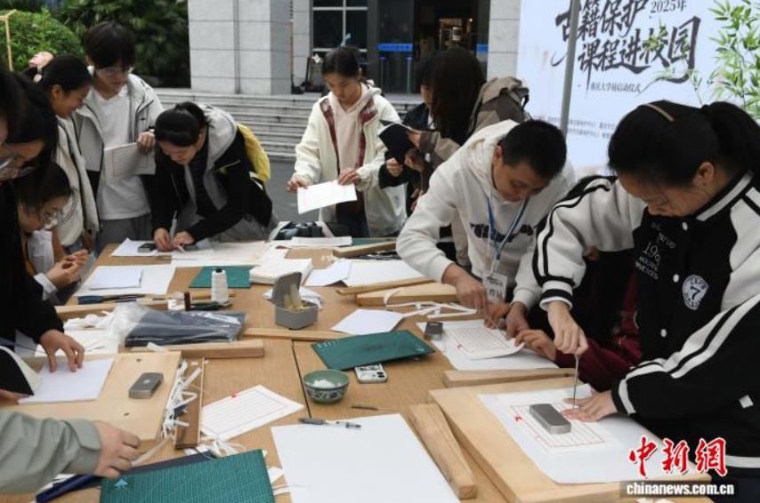 當天,古籍修復技藝體驗活動在校內同步開展。重慶圖書館(重慶古籍保護中心)的古籍修復師們為重慶大學師生帶來手抄經典、碑刻傳拓、雕版印刷、線裝書裝訂、古籍修復5項傳統技藝體驗。