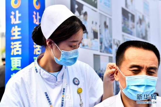 5月20日,在山東國際會展中心,濟南護理職業學院學生進行耳穴壓豆技能展示。