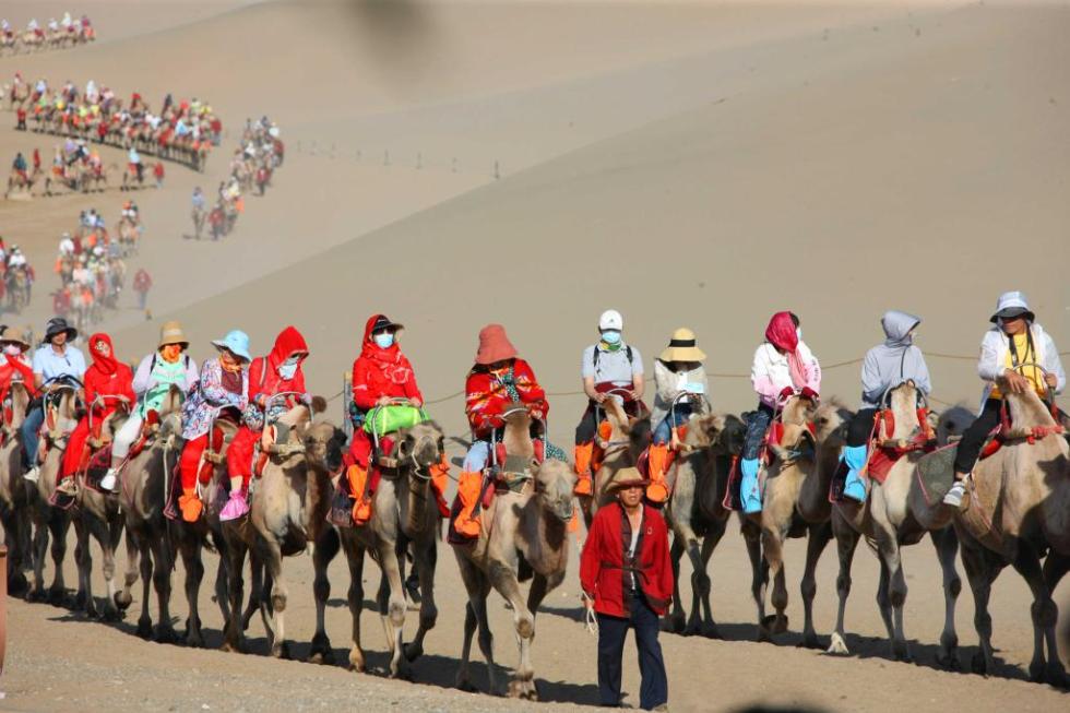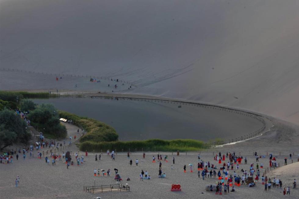 月牙泉邊、鳴沙山上騎駱駝的游客。新華社記者劉詩平 攝