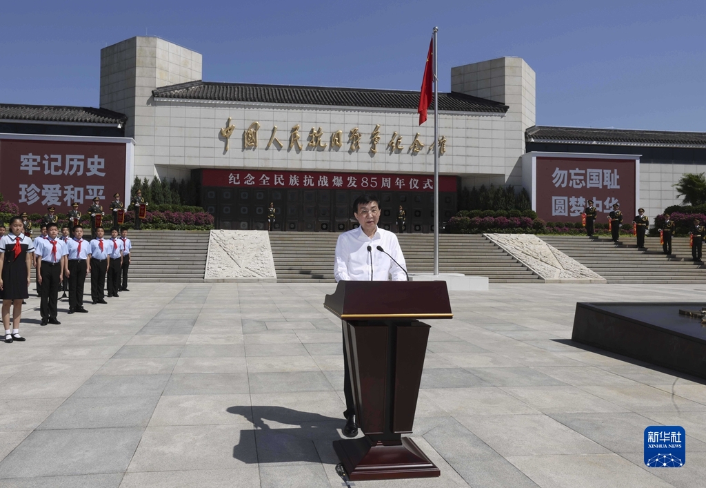 新華社北京7月7日電 紀念全民族抗戰爆發85周年儀式7日上午在中國人民抗日戰爭紀念館舉行。中共中央政治局常委、中央書記處書記王滬寧出席儀式并講話。