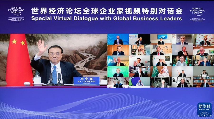 7月19日晚,國務院總理李克強在北京人民大會堂出席世界經濟論壇全球企業家視頻特別對話會,發表致辭并同企業家代表互動交流。世界經濟論壇主席施瓦布主持,來自50多個國家的近400位企業家參加。新華社記者 翟健嵐 攝