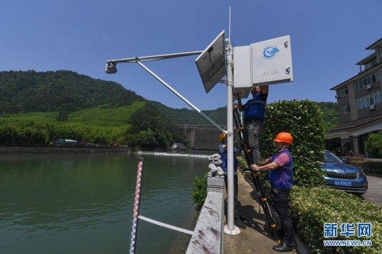 5月25日,工作人員在杭州市臨安區里畈水庫巡查庫下流量自動監測設備,該設備具備自動監測和數據實時上傳功能。