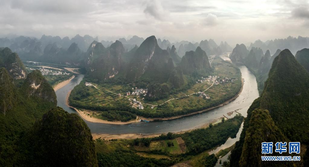 這是2018年10月18日拍攝的廣西桂林陽朔縣興坪鎮的漓江景色(無人機拼接照片)。新華社記者 李鑫 攝